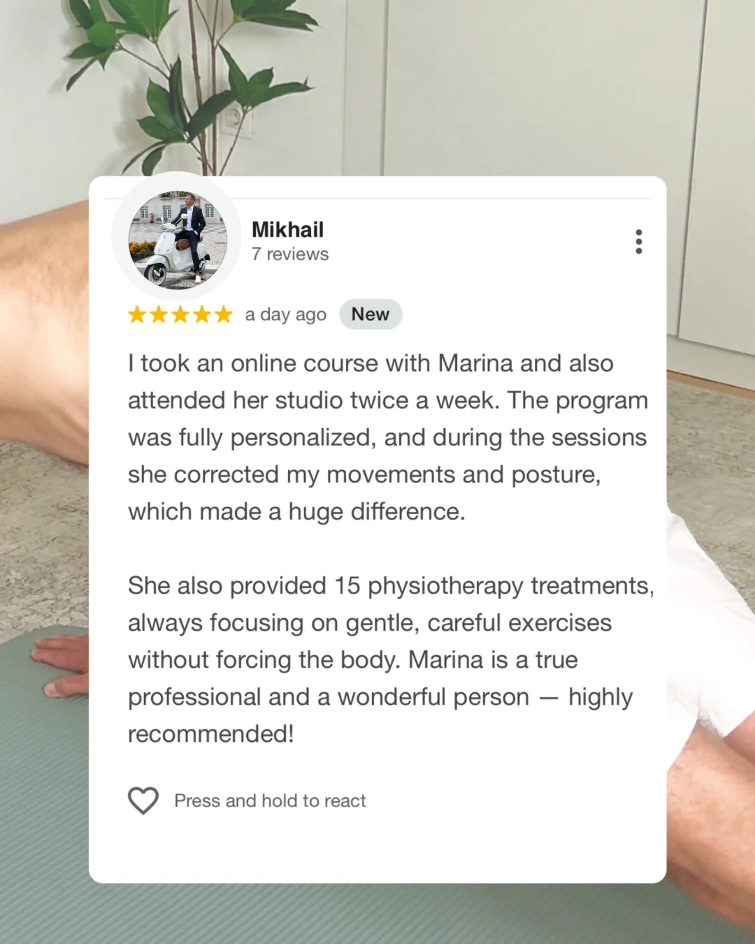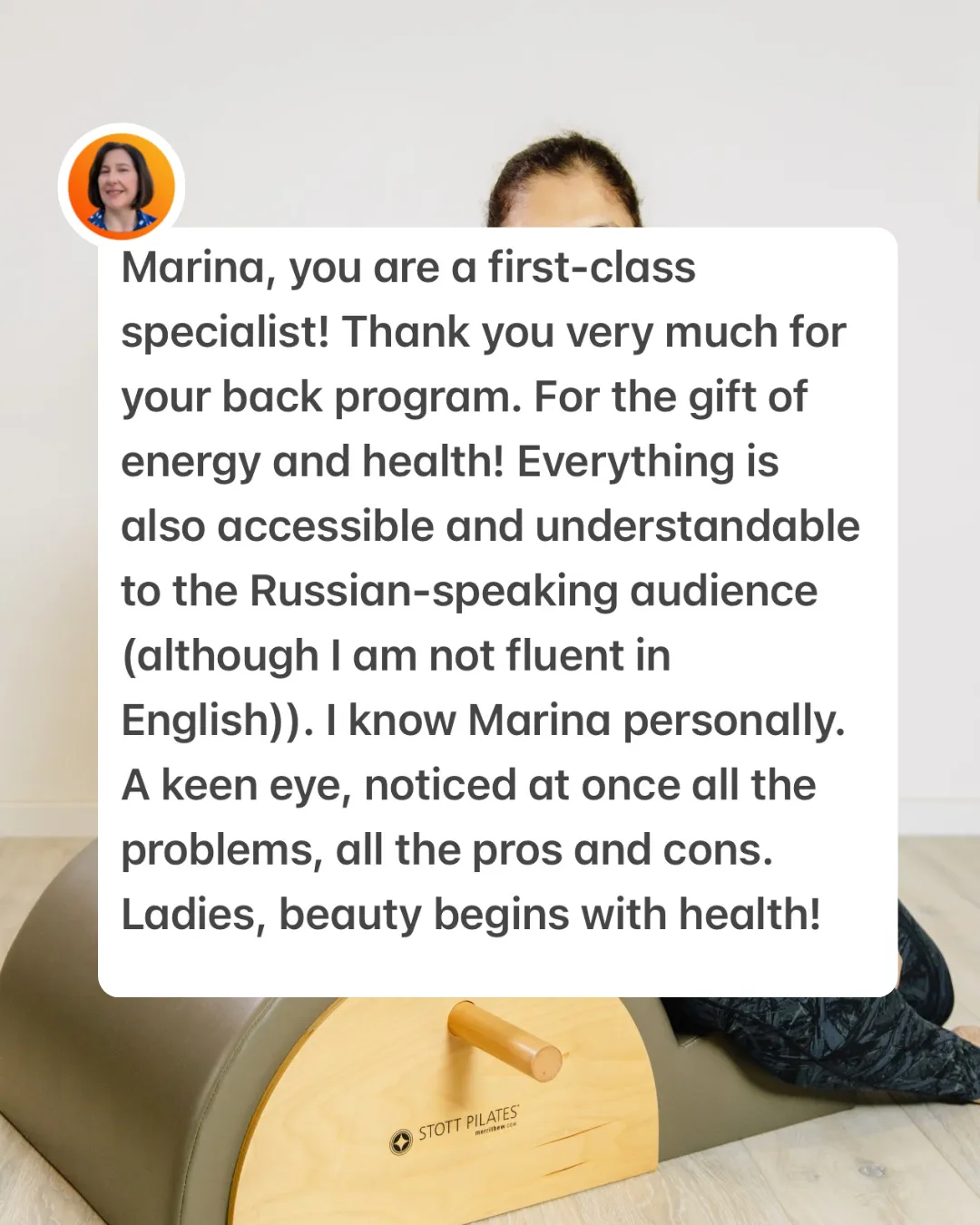 exercises, and sustainable lifestyle changes. This course emphasizes the integration of Physical therapy and Pilates methodology to create an effective approach to back health. This program is ideal for people with moderate to severe back pain (self-assessed at 5-8 out of 10).